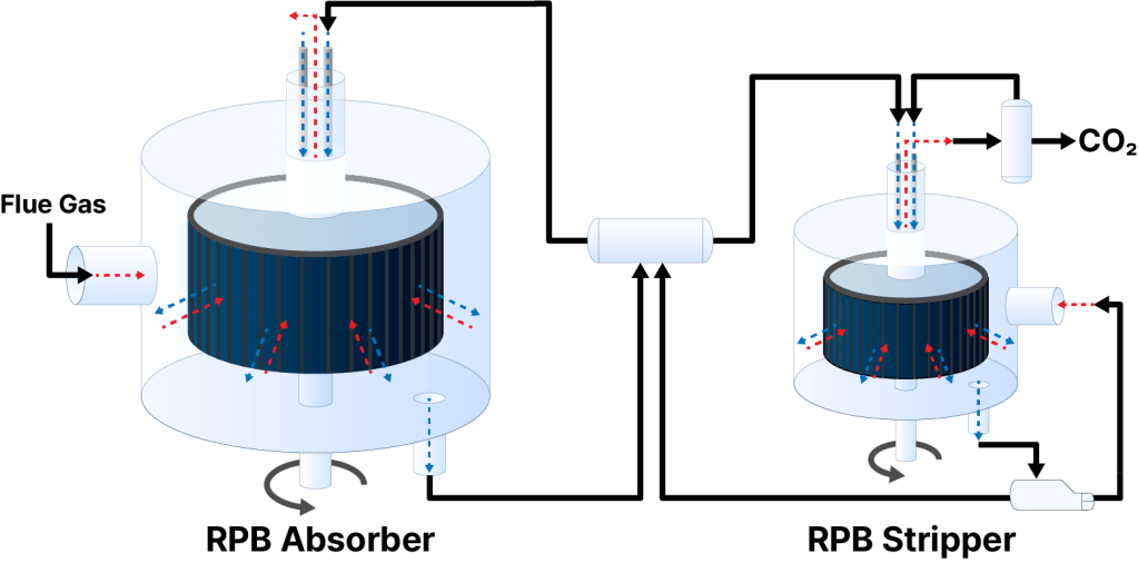 기존의 CO₂ 포집 공정은 대형 흡수탑을 사용하기 때문에 상당한 설치 공간과 높은 자본 비용이 요구됩니다. 이에 반해 Rotating Packed Bed(RPB) 기술은 원심력을 활용해 물질전달 속도를 크게 향상시킴으로써, 동일한 처리 성능을 훨씬 작은 설치 면적으로 구현할 수 있어 차세대 포집 기술로 주목받고 있습니다.